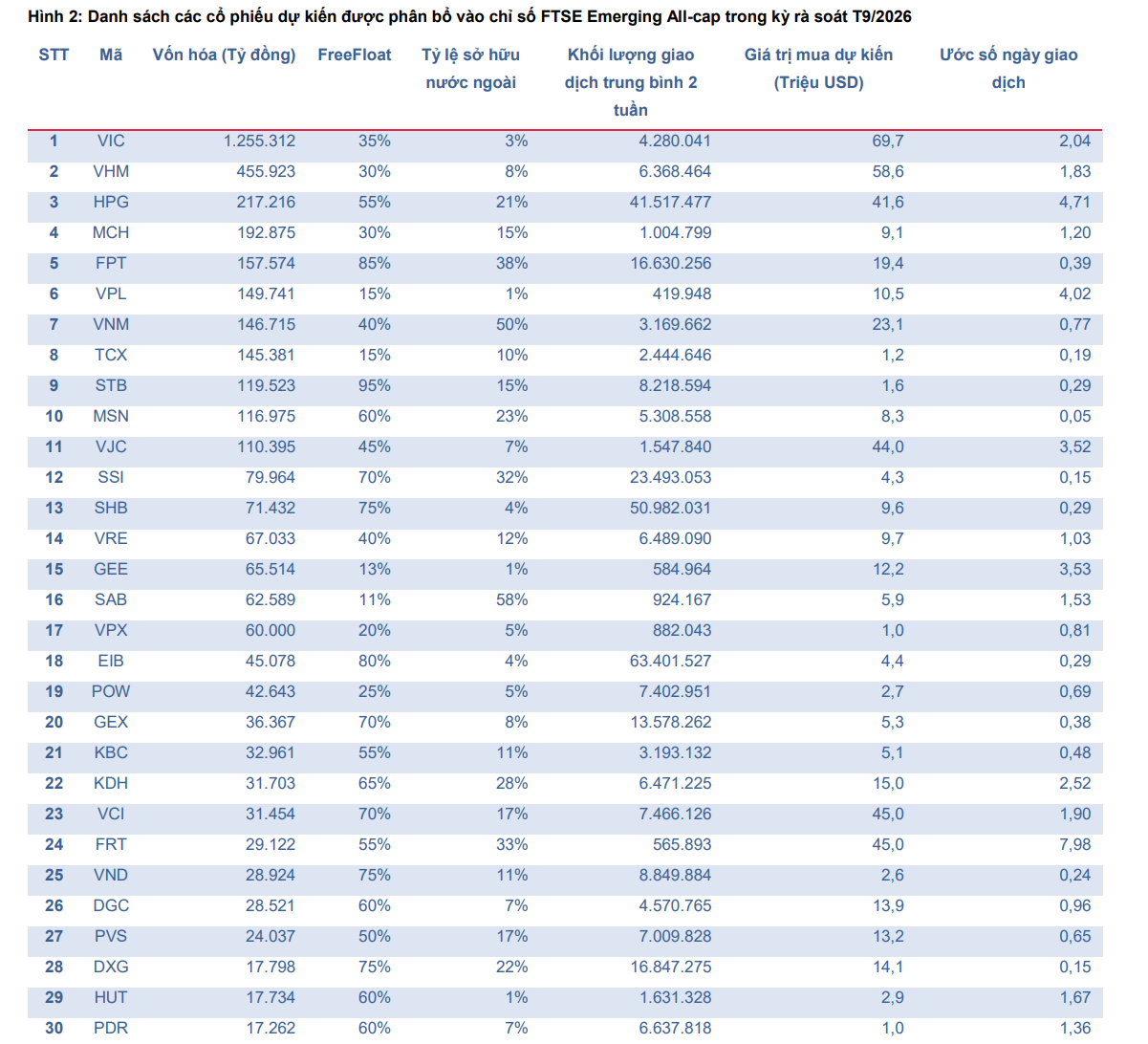 Bên cạnh dòng tiền, MBS Research cũng mô phỏng danh mục cổ phiếu có khả năng được lựa chọn vào FTSE Global All-Cap Index cùng khối lượng giao dịch dự kiến khi các quỹ thực hiện cơ cấu trong kỳ rà soát tháng 9/2026.