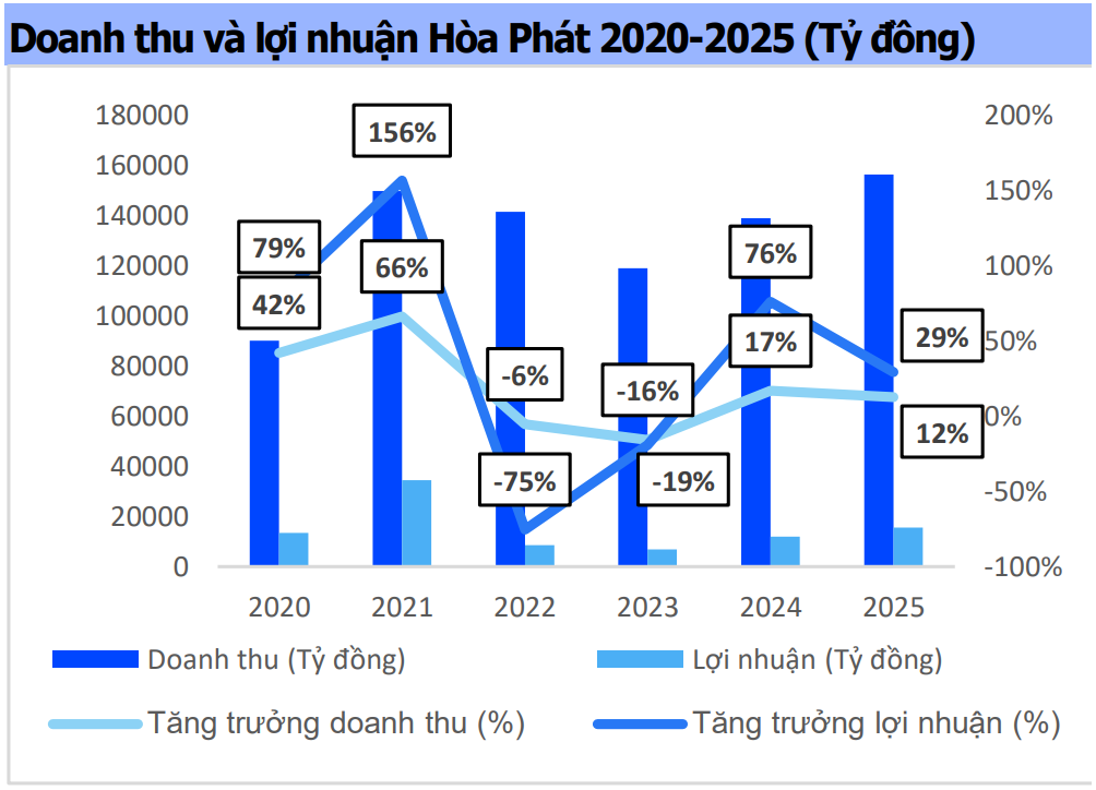 Năm 2025 đánh dấu một giai đoạn phục hồi rõ nét của Công ty CP Tập đoàn Hòa Phát (HPG) khi doanh thu hợp nhất đạt 156.116 tỷ đồng, tăng 12% so với năm trước, trong khi lợi nhuận sau thuế đạt 15.515 tỷ đồng, tăng gần 29%. Trong bối cảnh ngành thép toàn cầu còn nhiều biến động về giá nguyên liệu và thương mại, kết quả này phản ánh sự cải thiện đồng thời ở cả sản lượng và hiệu quả vận hành.