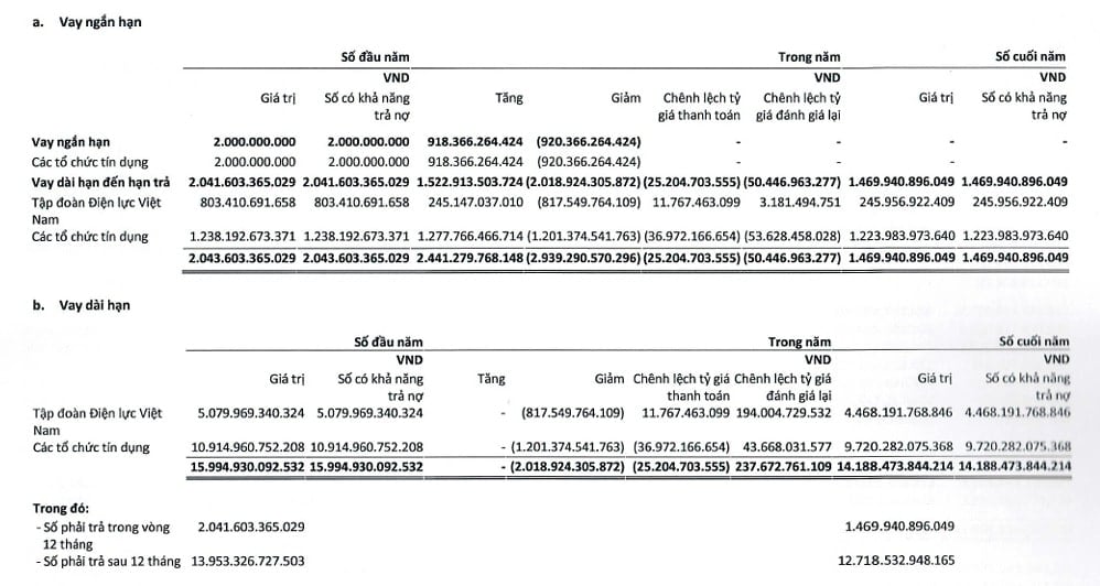 Nếu tính riêng các khoản vay, tổng dư nợ cuối năm chỉ còn 14.188 tỷ đồng, trong đó 1.470 tỷ đồng đến hạn trong vòng một năm (đã hạch toán vào nợ ngắn hạn) và 12.719 tỷ đồng là nghĩa vụ dài hạn. Phần lớn nợ dài hạn đến từ các khoản vay ngoại tệ được Chính phủ bảo lãnh, gồm 4.468 tỷ vay lại từ EVN và khoảng 9.720 tỷ vay các tổ chức quốc tế như Ngân hàng Thế giới, Ngân hàng Hợp tác Quốc tế Nhật Bản, Ngân hàng Xuất nhập khẩu Trung Quốc… với lãi suất từ 0,95% đến 8,25%#năm tùy loại tiền tệ.<#p>EVNGENCO2 không có khoản vay mới trong năm 2024, trong khi vẫn tích cực trả nợ gốc<#figcaption><#figure>