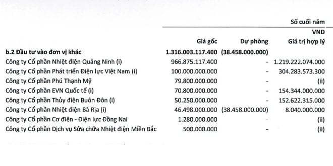 Đầu tư vào các đơn vị khác đạt 1.316 tỷ đồng (đã trích dự phòng 38,4 tỷ). Các khoản đáng chú ý gồm Nhiệt điện Quảng Ninh (giá gốc 966,87 tỷ; giá trị hợp lý 1.219,2 tỷ), Phát triển Điện lực Việt Nam (giá gốc 100 tỷ; giá trị hợp lý 304,2 tỷ), EVN Quốc tế (giá gốc 70,8 tỷ; giá trị hợp lý 154,3 tỷ) và Thủy điện Buôn Đôn (giá gốc 50,25 tỷ; giá trị hợp lý 152,62 tỷ). Riêng khoản đầu tư vào Nhiệt điện Bà Rịa được trích lập dự phòng 38,45 tỷ đồng khi giá trị hợp lý chỉ còn khoảng 8 tỷ đồng.<#p>