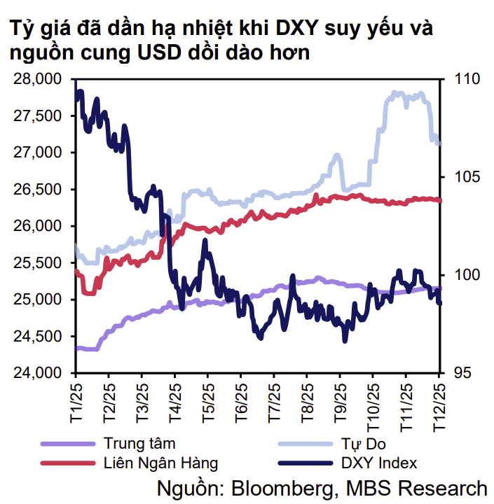 Thực tế, tỷ giá ghi nhận đã hạ nhiệt từ giữa tháng 11. Tính đến 11/12, MBS Research ghi nhận tỷ giá liên ngân hàng ở mức 26.346 VND/USD, giảm 0,3% so với đỉnh và tăng 3,5% so với đầu năm; tỷ giá tự do giảm 2,5% từ đỉnh. Với dự báo USD quốc tế suy yếu và nguồn cung ngoại tệ cải thiện nhờ xuất khẩu và kiều hối, MBS Research cho rằng tỷ giá USD-VND chỉ tăng khoảng 2,2 - 2,5% trong năm 2026.