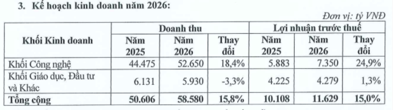 Trong cơ cấu kế hoạch 2026, khối công nghệ tiếp tục đóng vai trò chủ lực với doanh thu dự kiến 52.650 tỷ đồng và lãi trước thuế 7.350 tỷ đồng, lần lượt tăng 18% và 25% so với năm trước.