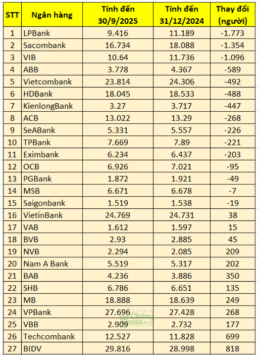 Ngân hàng<#span>Gần 7.500 nhân viên rời khỏi ngành ngân hàng trong 9 tháng đầu năm, nhà băng nào mất người nhiều nhất?<#h1>