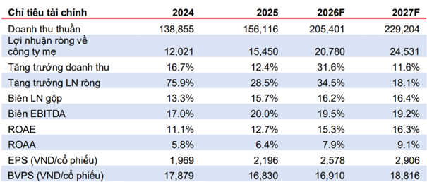 Về doanh thu, MBS ước tính năm 2026 có thể đạt hơn 205.000 tỷ đồng, tăng trên 30% so với năm trước. Lợi nhuận ròng được dự báo tăng khoảng 34%, chủ yếu nhờ sản lượng tăng mạnh và biên lợi nhuận gộp cải thiện.