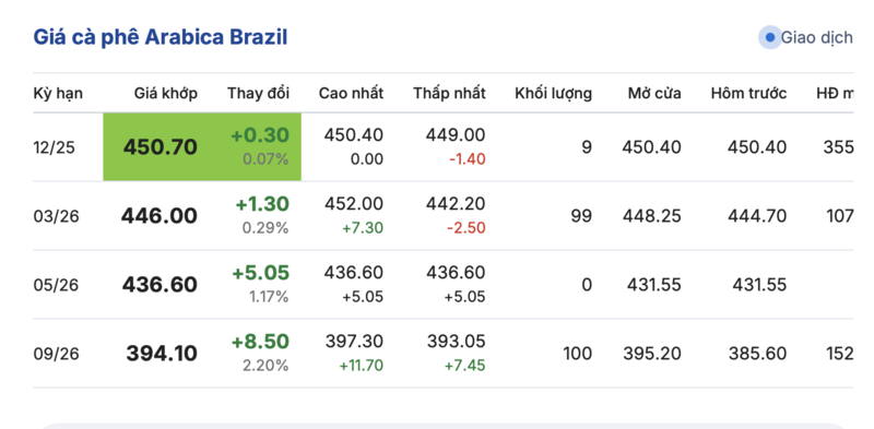 Trong khi đó, tại sàn giao dịch Brazil, giá cà phê Arabica cùng tăng đồng loạt so với ngày hôm qua. Cụ thể, hợp đồng giao kỳ hạn tháng 12/2025 đạt 450,7 US cent/pound, tăng 0,07% so với ngày hôm qua. Hợp đồng giao kỳ hạn tháng 9/2026 đạt 394,1 US cent/pound, tăng 0,29%. Trong khi hợp đồng giao kỳ hạn tháng 5/2026 tăng 1,17%, hiện ở mức 436,6 US cent/pound.