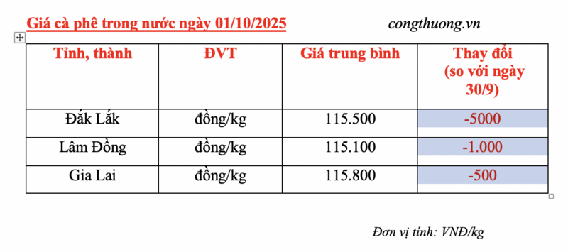Tại thị trường trong nước, giá cà phê hôm nay 01/10, tại các tỉnh khu vực Tây Nguyên quay đầu giảm nhẹ trở lại so với ngày hôm qua. Hiện cà phê tại thị trường trong nước được thu mua với giá trung bình 116.000 đồng/kg, giảm 5000 đồng/kg.