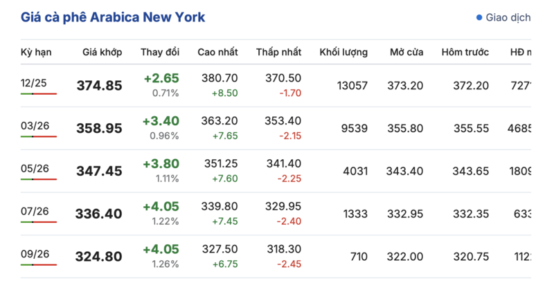 Trên sàn giao dịch New York, giá cà phê Arabica tăng nhẹ giao kỳ hạn tháng 12/2025 tăng 0,71% (2,65 US cent/pound) so với hôm qua, đạt 374,85 US cent/pound. Hợp đồng giao tháng 3/2026 tăng 0,96% (3,4 US cent/pound), lên mức 358,95 US cent/pound.