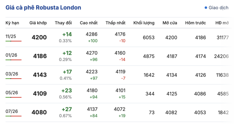 Trên sàn giao dịch London, giá cà phê trực tuyến Robusta tăng nhẹ sau phiên giảm giá hôm qua. Cụ thể, hợp đồng giao kỳ hạn tháng 11/2025 đóng cửa ở mức 4.200 USD/tấn, tăng 0.332% (14 USD/tấn) so với hôm qua. Hợp đồng giao kỳ hạn tháng 1/2026 tăng 0.92% (12 USD/tấn), đạt 4.186 USD/tấn.