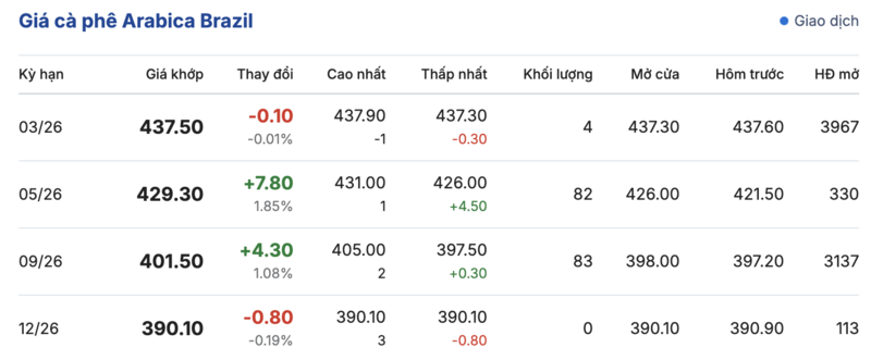 Kết thúc phiên giao dịch gần nhất, cà phê Arabica Brazil tiếp tục ghi nhận biến động trái chiều trong các kỳ giao hàng. Cụ thể: kỳ hạn tháng 3/2026 đạt mức 437,5 cent/lb, giảm 0,1 cent/lb so với hôm qua. Kỳ giao hàng tháng 12/2026 cũng giảm nhẹ 0,8 cent/lb, đạt mức 390,1 cent/lb. Trái lại, kỳ giao hàng tháng 5/2026 vẫn tiếp tục tăng mạnh 7,8 cent/lb so với phiên giao dịch trước, hiện đang đạt mức 429,3 cent/lb.