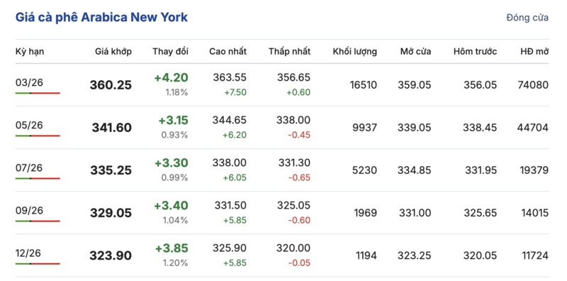 Tương tự, trên sàn New York, giá cà phê Arabica cũng ghi nhận phiên tăng giá liên tục trong các kỳ giao hàng. Cụ thể, kỳ giao tháng 3/2026 tiếp tục tăng nhẹ 4,2 cent/lb, đạt mức 360,25 cent/lb. Cùng chiều tăng, hợp đồng giao tháng 12/2026 ghi nhận tăng 3,85 cent/lb, lên mức 323,9 cent/lb.