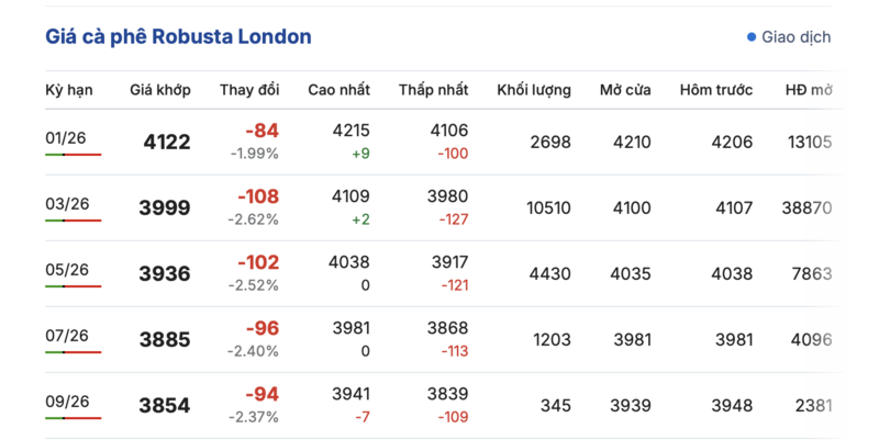 Kết thúc phiên giao dịch gần nhất, giá cà phê Robusta tại London giảm đồng loạt qua các kỳ giao hàng. Cụ thể, kỳ giao tháng 1/2026 giảm 84 USD/tấn, đạt mức 4122 USD/tấn. Trong khi hợp đồng giao kỳ hạn tháng 9/2026 giảm 94 USD/tấn, xuống mức 3845 USD/tấn.