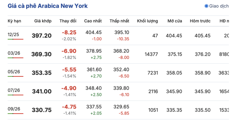 Tương tự, trên sàn New York, giá cà phê Arabica cũng ghi nhận giảm mạnh liên tục trong các kỳ giao hàng. Cụ thể, kỳ giao tháng 12/2025 giảm 8,25 cent/lb, đạt mức 397,2 cent/lb. Hợp đồng giao tháng 9/2026 giảm 4,75 cent/lb, đạt mức 330,75 cent/lb.