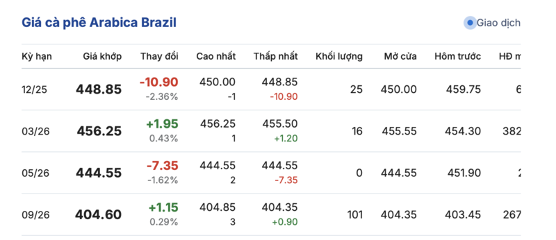 Kết thúc phiên giao dịch gần nhất, giá cà phê Arabica Brazil biến động trái chiều so với phiên giao dịch trước. Cụ thể: kỳ giao hàng tháng 12/2025 đạt mức 448,85 cent/lb, giảm mạnh 10,9 cent/lb so với hôm qua. Trái lại, kỳ giao hàng tháng 5/2026 lại tăng nhẹ 1,15 cent/lb, đạt mức 404,6 cent/lb.