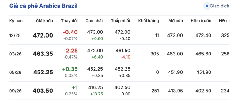 Còn tại sàn giao dịch Brazil, giá cà phê Arabica biến động trái chiều qua các kỳ giao hàng. Cụ thể, hợp đồng giao kỳ hạn tháng 12/2025 đạt 472,0 US cent/pound, giảm 0,07%. Hợp đồng giao kỳ hạn tháng 3/2026 xuống mức 463,35 US cent/pound, giảm 0,47% so với phiên giao dịch trước. Trái lại, hợp đồng giao kỳ hạn tháng 5/2026 tăng nhẹ 0,08% (0,35 US cent/pound), đạt mức 452,25 US cent/pound.