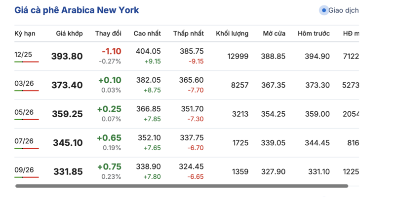 Trên sàn giao dịch New York, giá cà phê arabica biến động trái chiều so với phiên giao dịch trước đó. Cụ thể, hợp đồng giao kỳ hạn tháng 12/2025 giảm 0,27%, xuống còn 393,8 US cent/pound. Trong khi đó, hợp đồng giao kỳ hạn tháng 9/2026 lại tăng nhẹ 0,23% (0,75 US cent/pound) lên mức 331,85 US cent/pound.