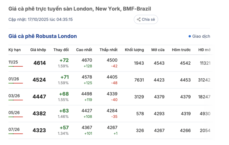 Trong phiên giao dịch sags nay (17/10), giá cà phê trực tuyến robusta hợp đồng giao kỳ hạn tháng 11/2025 trên sàn giao dịch London đạt 4614 USD/tấn, tăng 1,59% (72 USD/tấn) so với phiên giao dịch trước. Hợp đồng giao kỳ hạn tháng 1/2026 tăng 1,59% (71 USD/tấn), lên mức 4524 USD/tấn.
