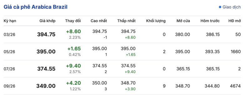 Kết thúc phiên giao dịch gần nhất, giá cà phê Arabica trên sàn Brazil cũng đồng loạt tăng mạnh trong các kỳ giao hàng. Cụ thể: kỳ hạn tháng 3/2026 đạt mức 394,75 cent/lb, đảo chiều tăng mạnh 8,6 cent/lb so với hôm qua. Tương tự, kỳ giao hàng tháng 9/2026 ghi nhận tăng nhẹ 4,2 cent/lb, lên mức 349,0 cent/lb.