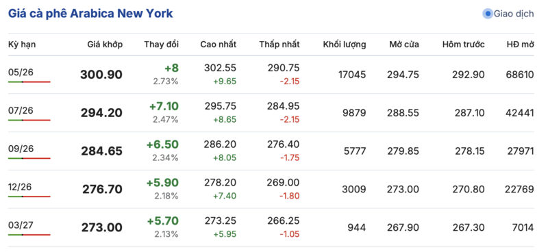 Tương tự, trên sàn New York, giá cà phê Arabica cũng ghi nhận tăng mạnh trong các kỳ giao hàng. Cụ thể, kỳ giao tháng 5/2026 tăng 8,0 cent/lb, đạt mức 300,9 cent/lb. Cùng chiều, hợp đồng giao tháng 3/2027 tăng 5,7 cent/lb, đạt mức 273,0 cent/lb.