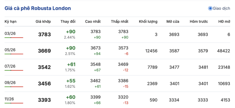 Cụ thể, kết thúc phiên giao dịch gần nhất, giá cà phê Robusta tại London tiếp tục ghi nhận phiên tăng giá đồng loạt. Trong đó, kỳ giao tháng 3/2026 tăng cao 90 USD/tấn, đạt mức 3.783 USD/tấn. Tương tự, hợp đồng giao kỳ hạn tháng 11/2026 cũng tăng thêm 60 USD/tấn, lên mức 3.393 USD/tấn.