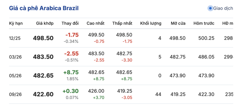 Kết thúc phiên giao dịch, giá cà phê Arabica Brazil biến động trái chiều so với phiên giao dịch hôm qua, dao động 422,6 - 498,5 cent/lb. Cụ thể: kỳ giao hàng tháng 12/2025 là 498,5 cent/lb, giảm nhẹ 0,34% so với phiên giao dịch trước. Kỳ giao hàng tháng 5/2026 lại tăng 1,85%, lên mức 482,65 cent/lb.
