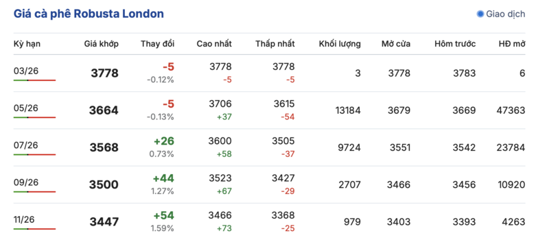 Cụ thể, trên sàn giao dịch London, giá cà phê Robusta sáng nay tiếp tục ghi nhận phiên biến động trái chiều trong các kỳ giao hàng. Trong đó, kỳ giao tháng 3/2026 đảo chiều giảm nhẹ 5 USD/tấn, đạt mức 3.778 USD/tấn. Trái lại, hợp đồng giao kỳ hạn tháng 11/2026 lại tăng thêm 54 USD/tấn, lên mức 3.447 USD/tấn.