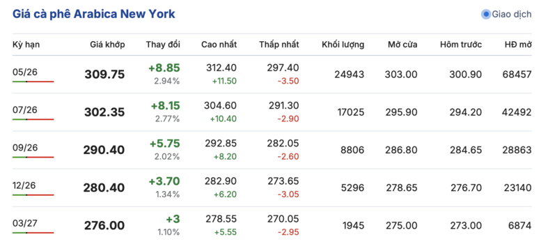 Trong khi đó, trên sàn New York, giá cà phê Arabica tiếp tục ghi nhận tăng đồng loạt trong các kỳ giao hàng. Cụ thể, kỳ giao tháng 5/2026 tăng mạnh 8,85 cent/lb, đạt mức 309,75 cent/lb. Tương tự, hợp đồng giao tháng 3/2027 tăng nhẹ 3,0 cent/lb, đạt mức 276,0 cent/lb.