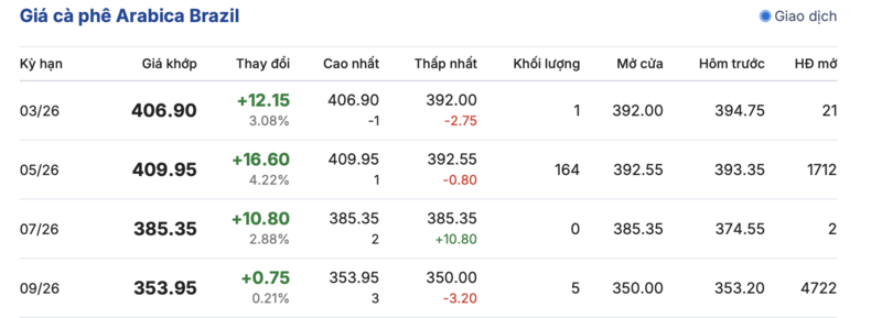 Kết thúc phiên giao dịch gần nhất, giá cà phê Arabica trên sàn Brazil cũng ghi nhận tăng đồng loạt trong các kỳ giao hàng. Cụ thể: kỳ hạn tháng 3/2026 đạt mức 406,9 cent/lb, tăng mạnh 12,15 cent/lb so với hôm qua. Trong khi đó, kỳ giao hàng tháng 9/2026 ghi nhận tăng nhẹ 0,75 cent/lb, lên mức 353,95 cent/lb.