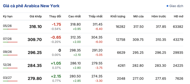 Trong khi đó, trên sàn New York, giá cà phê Arabica cũng ghi nhận phiên biến động trái chiều trong các kỳ giao hàng. Cụ thể, kỳ giao tháng 5/2026 giảm 1,75 cent/lb, đạt mức 316,1 cent/lb. Còn hợp đồng giao tháng 3/2027 tăng thêm 2,15 cent/lb, đạt mức 279,8 cent/lb.