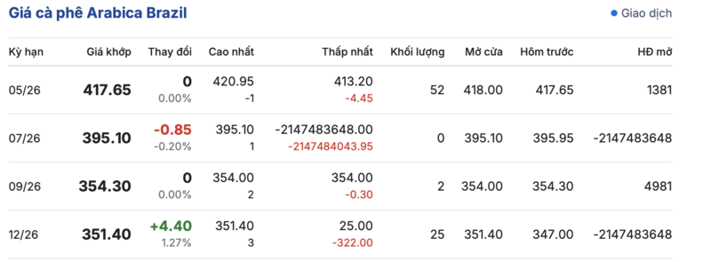 Kết thúc phiên giao dịch gần nhất, giá cà phê Arabica trên sàn Brazil tiếp tục ghi nhận phiên điều chỉnh trái chiều. Cụ thể: kỳ hạn tháng 3/2026 đạt mức 417,65 cent/lb, không biến động so với hôm qua. Trong khi đó, kỳ giao hàng tháng 9/2026 ghi nhận tăng nhẹ 4,4 cent/lb, lên mức 351,4 cent/lb.