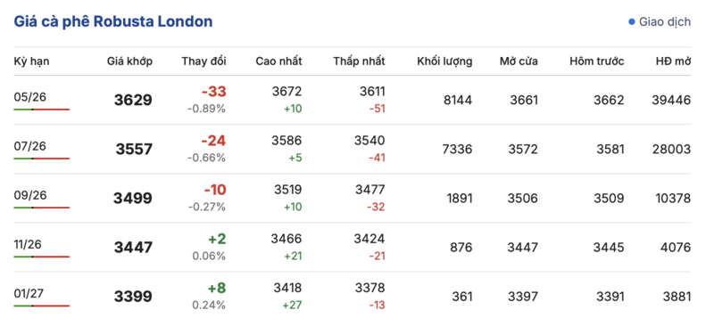 Cụ thể, trên sàn giao dịch London, giá cà phê Robusta sáng nay ghi nhận phiên tăng giảm đan xen trong các kỳ giao hàng. Trong đó, kỳ giao tháng 3/2026 đảo chiều giảm nhẹ 33 USD/tấn, đạt mức 3.629 USD/tấn. Trái chiều, hợp đồng giao kỳ hạn tháng 11/2026 lại tăng nhẹ 8 USD/tấn, lên mức 3.399 USD/tấn.