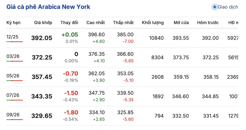 Tương tự, trên sàn New York, giá cà phê Arabica cũng biến động trái chiều. Kỳ giao tháng 12/2025 tăng 0,05 cent/lb, lên mức 389,85 cent/lb. Hợp đồng giao tháng 9/2026 giảm 0,4 cent/lb, đạt mức 329,75 cent/lb. Trong khi hợp đồng giao tháng 7/2026 cũng giảm 1,5 cent/lb, đạt 343,35 cent/lb.