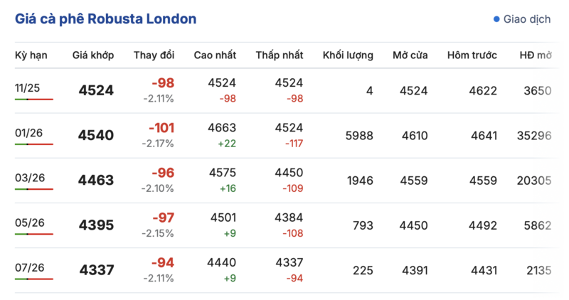Kết thúc phiên giao dịch gần nhất, giá cà phê Robusta tại London giảm đồng loạt trong các kỳ giao hàng. Cụ thể, kỳ giao tháng 11/2025 giảm 98 USD/tấn, đạt mức 4.524 USD/tấn. Hợp đồng giao kỳ hạn tháng 3/2026 cũng giảm 96 USD/tấn, ở mức 4.463 USD/tấn. Trong khi hợp đồng giao kỳ hạn tháng 7/2026 giảm 94 USD/tấn, ở mức 4337 USD/tấn.