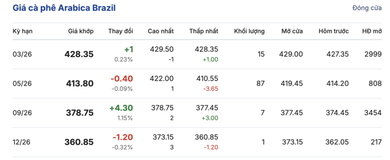 Kết thúc phiên giao dịch gần nhất, cà phê Arabica Brazil tiếp tục ghi nhận phiên biến động trái chiều trong các kỳ giao hàng. Cụ thể: kỳ hạn tháng 3/2026 đạt mức 428,35 cent/lb, đảo chiều tăng nhẹ 1,0 cent/lb so với hôm qua. Trái lại, kỳ giao hàng tháng 12/2026 lại ghi nhận giảm nhẹ 1,2 cent/lb, xuống mức 360,85 cent/lb.