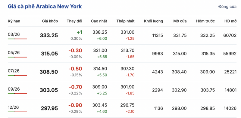 Tương tự, trên sàn New York, giá cà phê Arabica ghi nhận các phiên tăng giảm đan xen trong các kỳ giao hàng. Cụ thể, kỳ giao tháng 3/2026 đảo chiều tăng nhẹ 1,0 cent/lb, lên mức 333,25 cent/lb. Trái lại, hợp đồng giao tháng 12/2026 tiếp tục giảm nhẹ 0,9 cent/lb, đạt mức 297,95 cent/lb.