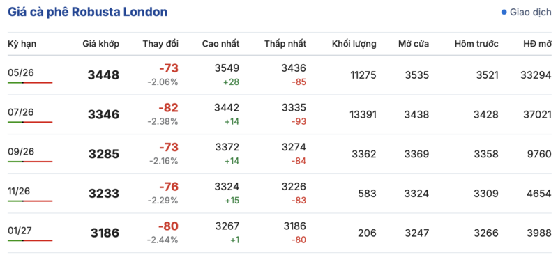 Cụ thể, trên sàn giao dịch London, giá cà phê Robusta sáng nay ghi nhận phiên đảo chiều, giảm mạnh đồng loạt trong các kỳ giao hàng so với phiên giao dịch trước. Trong đó, kỳ giao tháng 3/2026 giảm 73 USD/tấn, đạt mức 3.448 USD/tấn. Cùng chiều, hợp đồng giao kỳ hạn tháng 1/2027 cũng giảm mạnh 80 USD/tấn, xuống mức 3.186 USD/tấn.