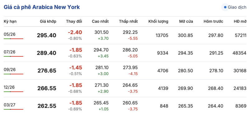 Trong khi đó, trên sàn New York, giá cà phê Arabica hôm nay cũng ghi nhận phiên giảm giá. Cụ thể, kỳ giao tháng 5/2026 giảm nhẹ 2,4 cent/lb, đạt mức 295,4 cent/lb. Hợp đồng giao kỳ hạn tháng 3/2027 tiếp tục giảm nhẹ 1,85 cent/lb, xuống mức 262,55 cent/lb.