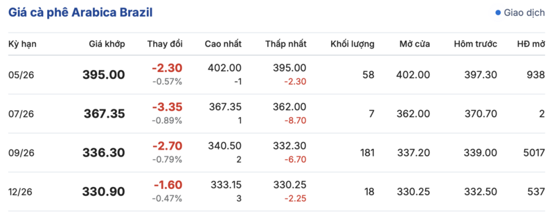 Kết thúc phiên giao dịch gần nhất, giá cà phê Arabica trên sàn Brazil cũng ghi nhận phiên điều chỉnh. Cụ thể, kỳ hạn tháng 5/2026 đạt mức 395,0 cent/lb, giảm 2,3 cent/lb so với hôm qua. Trong khi đó, kỳ giao hàng tháng 12/2026 ghi nhận giảm nhẹ 1,6 cent/lb, đạt mức 330,9 cent/lb.