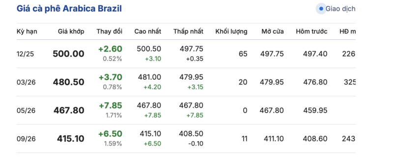 Kết thúc phiên giao dịch gần nhất, giá cà phê Arabica Brazil cũng tăng đồng loạt so với phiên giao dịch trước. Cụ thể: kỳ giao hàng tháng 12/2025 là 500,0 cent/lb, tăng 2,6 cent/lb so với phiên giao dịch trước. Kỳ giao hàng tháng 9/2026 tăng 6,5 cent/lb, lên mức 415,1 cent/lb.