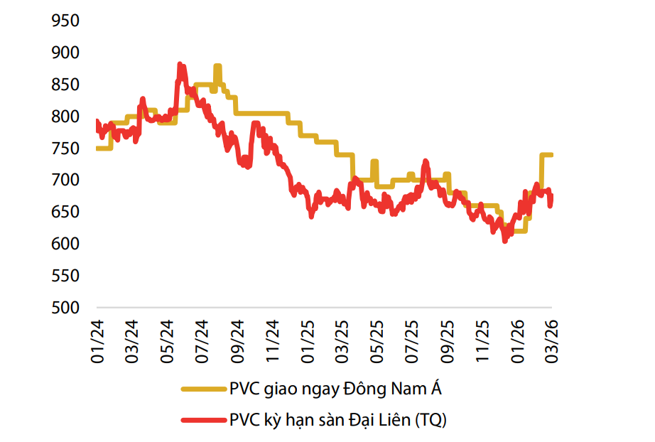 margin: 15px auto;" />Theo các đánh giá thị trường, giá hạt nhựa PVC đã có nhịp phục hồi từ vùng đáy cuối năm 2025, song dư địa tăng mạnh trong năm 2026 được cho là khá hạn chế. Tính đến đầu tháng 3/2026, giá PVC giao ngay tại Trung Quốc tăng khoảng 13% so với mức đáy trước đó, trong khi tại khu vực Đông Nam Á cũng ghi nhận mức tăng khoảng 20%, lên quanh 740 USD/tấn.