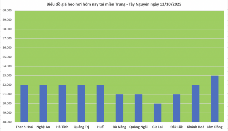 Cụ thể, Thanh Hóa, Nghệ An, Hà Tĩnh, Quảng Trị, Khánh Hòa và Huế giữ giá 52.000 đồng/kg; Quảng Ngãi, Đà Nẵng và Đắk Lắk ở mức 51.000 đồng/kg; Gia Lai tiếp tục là địa phương có giá thấp nhất khu vực với 50.000 đồng/kg. Lâm đồng giữ mức cao nhất khu vực là 53.000 đồng/kg.