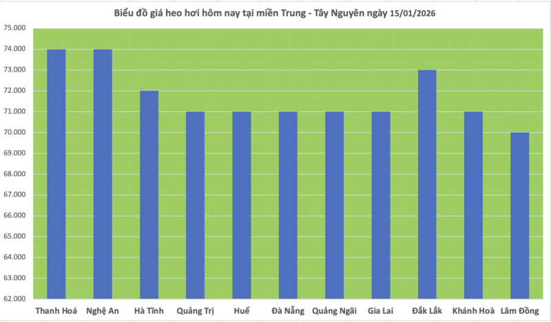 Một loạt các tỉnh bao gồm Quảng Trị, Huế, Đà Nẵng, Quảng Ngãi, Gia Lai và Khánh Hòa cùng tăng thêm 1.000 đồng/kg, đạt chung mức giá 71.000 đồng/kg. Tỉnh Lâm Đồng cũng tăng nhẹ 1.000 đồng/kg, lên mức 70.000 đồng/kg.
