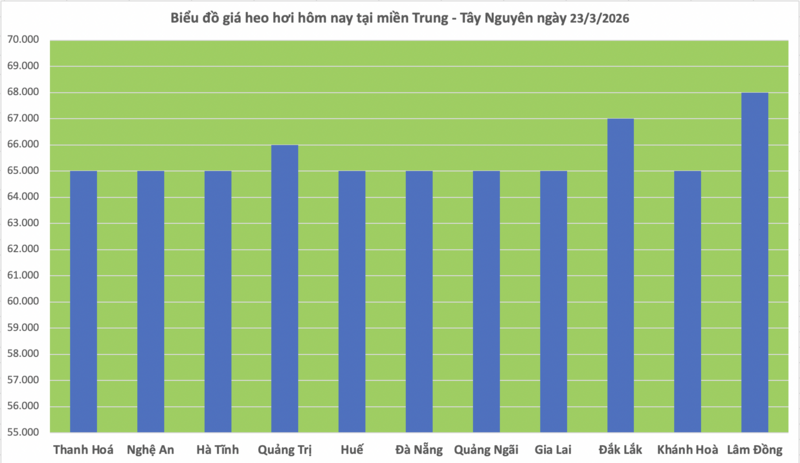 Trong khi đó, Hà Tĩnh, Huế, Đà Nẵng, Quảng Ngãi, Gia Lai và Khánh Hòa cùng giữ mức 65.000 đồng/kg; Quảng Trị duy trì mức 66.000 đồng/kg; Lâm Đồng tiếp tục là địa phương có giá cao nhất khu vực với 68.000 đồng/kg.