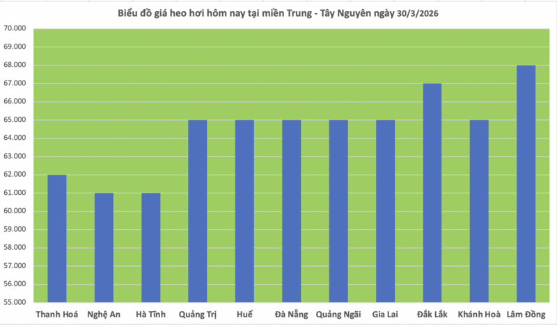 Trong khi đó, các địa phương Quảng Trị, Huế, Đà Nẵng, Quảng Ngãi, Gia Lai và Khánh Hòa tiếp tục đi ngang ở mức 65.000 đồng/kg.