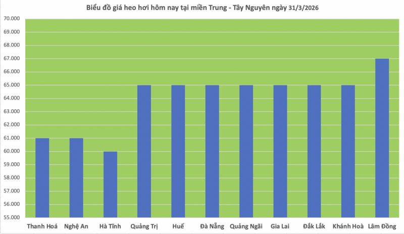 Ở chiều đi ngang, Nghệ An giữ mức 61.000 đồng/kg. Các địa phương Quảng Trị, Huế, Đà Nẵng, Quảng Ngãi, Gia Lai và Khánh Hòa tiếp tục ổn định ở mức 65.000 đồng/kg.