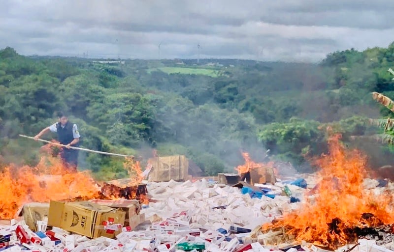 Lực lượng quản lý thị trường tiến hành tiêu huỷ số lượng lớn thuốc lá điếu nhập lậu. Ảnh: QLTT