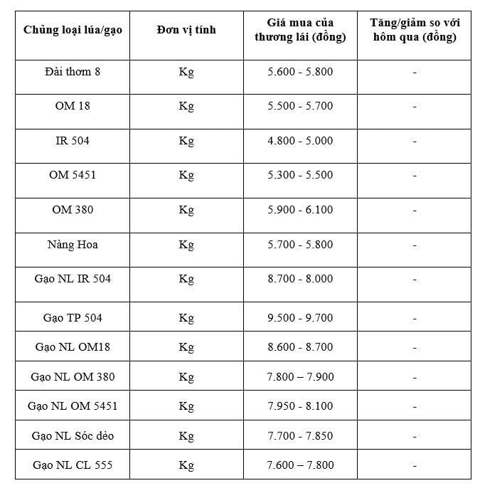 Trong đó với mặt hàng gạo, theo cập nhật từ Sở Nông nghiệp và Môi trường tỉnh An Giang, hiện gạo nguyên liệu xuất khẩu OM 5451 dao động ở mức 7.950 - 8.100 đồng/kg; gạo nguyên liệu xuất khẩu CL 555 dao động ở mức 7.600 - 7.800 đồng/kg; gạo nguyên liệu xuất khẩu Sóc dẻo dao động ở mức 7.700 - 7.850; gạo nguyên liệu xuất khẩu IR 504 dao động ở mức 7.700 - 8.000 đồng/kg; gạo nguyên liệu xuất khẩu OM 18 dao động ở mức 8.500 - 8.600 đồng/kg;; gạo nguyên liệu xuất khẩu OM 380 dao động ở mức 7.800 - 7.900 đồng/kg; gạo nguyên liệu xuất khẩu IR 504 dao động ở mức 8.100 - 8.250 đồng/kg; gạo thành phẩm OM 380 dao động ở 8.800 - 9.000 đồng/kg; gạo thành phẩm IR 504 dao động ở 9.500 - 9.700 đồng/kg so với hôm qua.