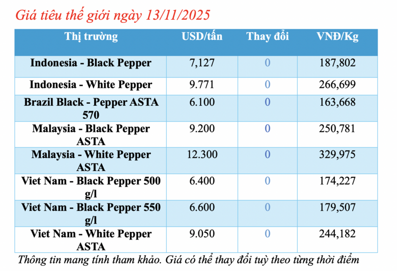 Cập nhật giá tiêu thế giới từ Hiệp hội Hồ tiêu Quốc tế (IPC) lúc 4 giờ 30 phút sáng 13/11/2025, hồ tiêu xuất khẩu hôm nay không ghi nhận biến động. Các thị trường đều ổn định giá so với phiên giao dịch hôm qua.