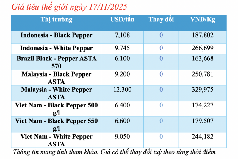 Cập nhật giá tiêu thế giới từ Hiệp hội Hồ tiêu Quốc tế (IPC) lúc 4 giờ 30 phút sáng 17/11/2025, hồ tiêu xuất khẩu hôm nay không ghi nhận biến động. Các thị trường đều ổn định giá so với phiên giao dịch hôm qua.