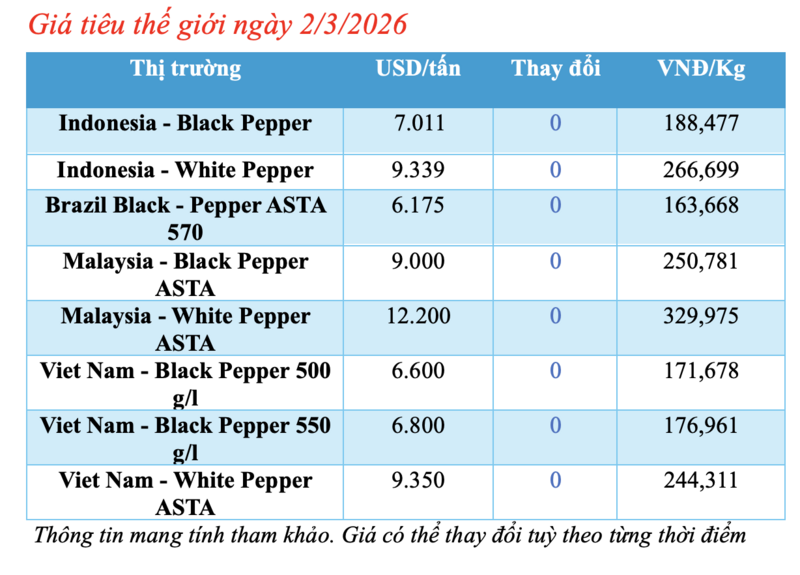 Cập nhật giá tiêu thế giới từ Hiệp hội Hồ tiêu Quốc tế (IPC) sáng 2/3, hồ tiêu xuất khẩu hôm nay cũng không ghi nhận biến động mới. Các thị trường đều duy trì mức giá ổn định so với phiên giao dịch trước.