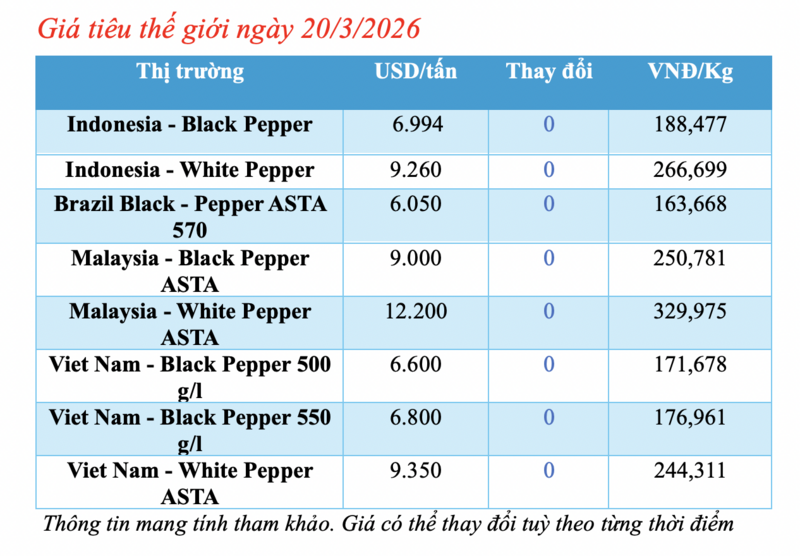 Cập nhật thị trường thế giới từ Hiệp hội Hồ tiêu Quốc tế (IPC) sáng 20/3, hồ tiêu xuất khẩu hôm nay không ghi nhận biến động mới. Các thị trường đều duy trì mức giá ổn định so với phiên giao dịch trước.
